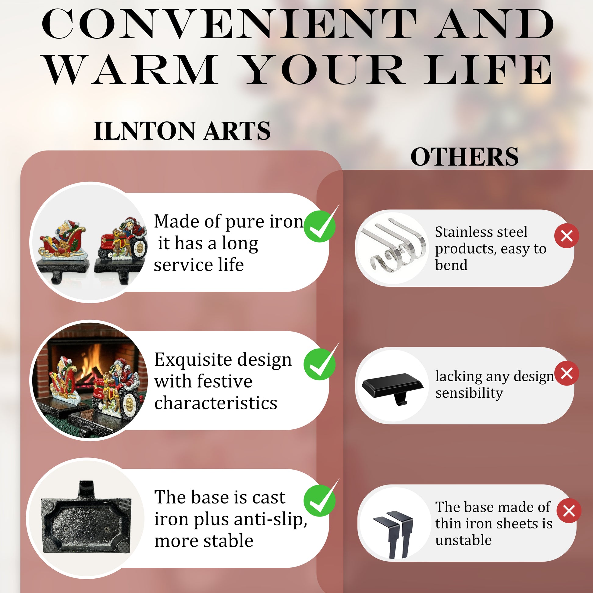 🎅 【Sturdy Material & Non-Slip Base】Heavy-duty cast iron construction holds stockings + gifts securely. 4 rubber pads prevent the stocking holders sliding on smooth surfaces (great for homes with kids & pets!)