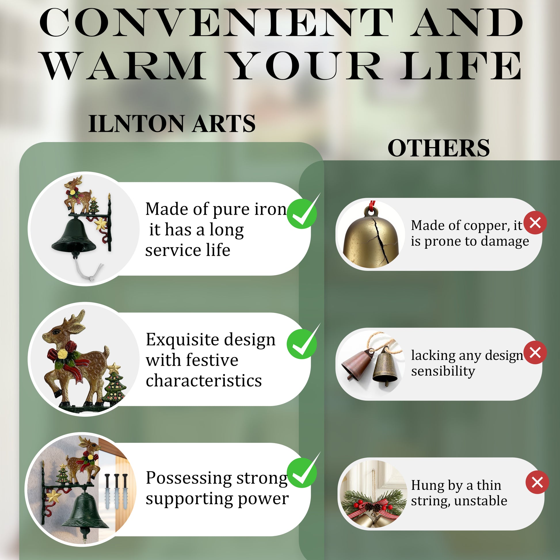 🦌【Perfect Christmas Atmosphere】Classic red/green combo with jingle bell sound instantly creates a cozy holiday vibe. The decorative dinner bell is ideal for doors, walls, porches, or shops to spread festive cheer.