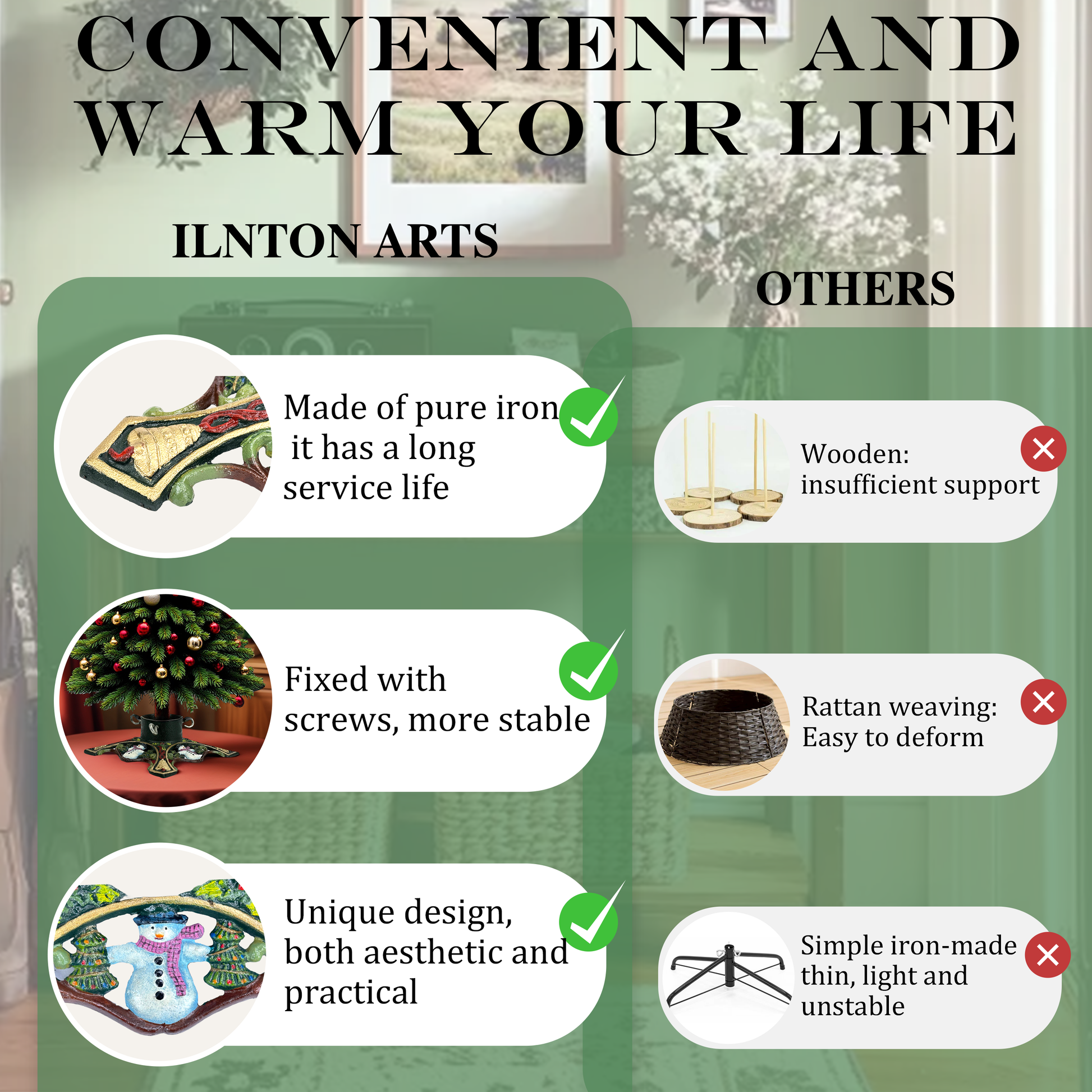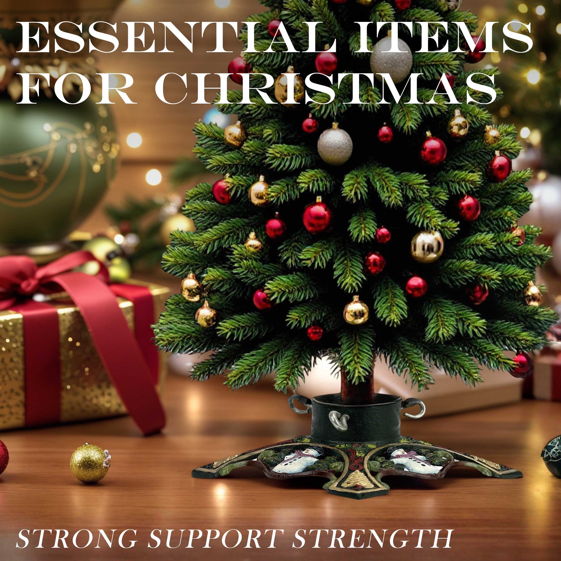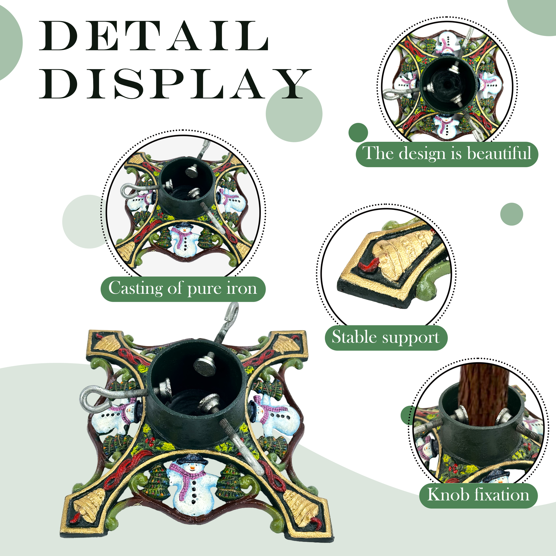Linton Arts Heavy Duty Christmas Tree Stand - 10" Cast Iron Base with Snowman & Bells Design, Rotating Knobs Fit Trees Up to 8ft, Anti-Tip Metal Stand for Holiday Decor